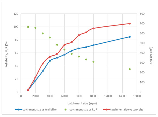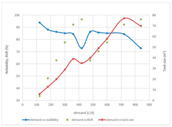 For the individual household case study, various demand sizes were investigated between 120 to 840 L per day (Figure 3), and the household size approximated to 6 people. Roof catchment sizes were maintained at 100 m2 for lower demand (Figure 4) in the range of 120 to 420 L per day, while a value of 200 m2 was used for demand above 420 L per day. For the hotel industry, these were treated as medium-intensive industries for which the policy [55] estimated a daily demand of 20 m3 per hectare, and this value was adopted in this study. The corresponding catchment size was varied between 2000 and 16,000 m2 (Figure 5). In all cases, a storage size was estimated, corresponding to optimal reliability. A target reliability of at least 70% was used as recommended by Ndomba and Wambura [47]. Note that the water captured by springs and streams is not considered in this model, while artificial infiltration can be regarded as part of the runoff harvested.