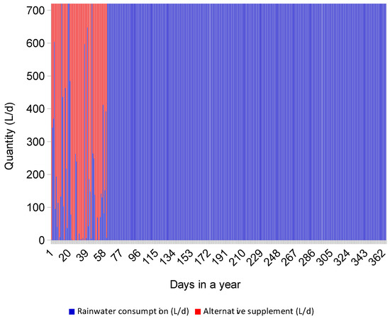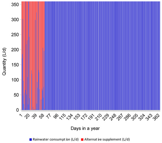 Daily requirements supplied through RWH (blue bars) and the corresponding required supplementary supply (red bars) to meet a demand of 720 L d−1 for a given family for a catchment area of 200 m2. Note that for any given day, the demand that is not met through RWH, is met through supplementary sources to meet the total demand (i.e., 720 L d−1).