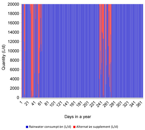 Daily requirements supplied through RWH (blue bars) and the corresponding required supplementary supply (red bars) to meet a demand of 20,000 L d−1 for a given hotel industry for a catchment area of 15,000 m2. Note that for any given day, the demand that is not met through RWH, is met through supplementary sources to meet the total demand (i.e., 20,000 L d−1).