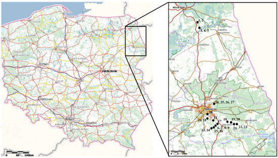 Map of the studied 28 wells in north-eastern Poland. Numbers 1–28 are according to Table 1.