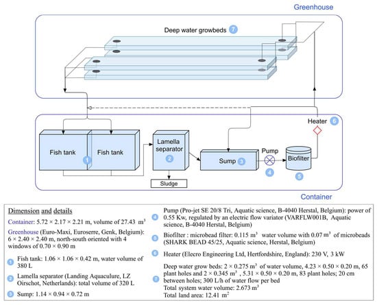 The experiment was conducted in the small scale, closed-loop, aquaponic system of the Integrated and Urban Plant Pathology Laboratory (IUPPL) of Gembloux Agro-Bio Tech (Gembloux, Belgium), named the Plant and Fish Farming box (PAFF Box) and already described in Eck et al. [10]. Figure 1 summarizes the functioning of the PAFF Box and provides additional technical information.