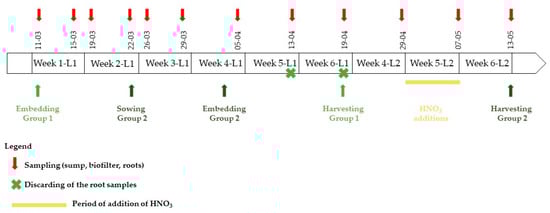Timeline of the experiment. Samplings were conducted in the four compartments simultaneously and are indicated by a red arrow. The first lettuce group was sown on 28 February 2019 and embedded on March 11. In parallel, a second group of lettuces was sowed on March 22 and embedded on April 3. Root samples from the first group of lettuce, which were collected on April 13 and 19 were discarded as the lettuces appeared diseased (Supplementary Materials, Figure S1). All lettuces from group 1 were then discarded and the focus of the study was shifted in group 2 starting from April 29.