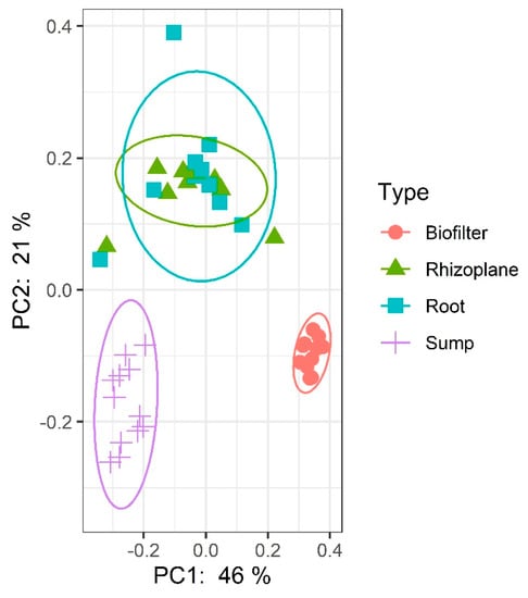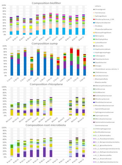 In terms of diversity, the four compartments are also very distinct (Table 1). The observed_otus and Shannon indices have been calculated for each compartment and compared with a pairwise Kruskal–Wallis test. The values obtained for both indices are coherent with our previous studies [9,10] and higher than those obtained by Schmautz et al. [2]. Concerning the Shannon index, the rhizoplane diversity is significantly higher than in the other compartments, followed by the root and biofilter compartments which have similar diversities. The sump compartment has a diversity significantly lower than the other three compartments. Concerning the observed-otus index, the rhizoplane is the richest compartment (significantly different from the other three compartments), followed by the biofilter (significantly different from the other three compartments) while the root and sump compartments harbor similar richness (Tables S1 and S2).