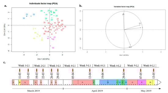 Water parameters (pH, temperature, EC and nitrate concentration) were monitored throughout the experiment with the help of specific probes located in the sump of the aquaponic system. The data obtained were considered valid for the entire system and were thus studied at first on the system scale. The water’s main parameters were followed and grouped utilizing a Principal Components Analysis (PCA) (Figure 4a,b) and a hierarchical clustering (Supplementary Materials, Figure S8). This resulted in 5 groups of sampling dates which, when put onto a timeline give us the following figure (Figure 4c). Details concerning the parameters’ values for each group are given in Supplementary Materials, Table S3.
