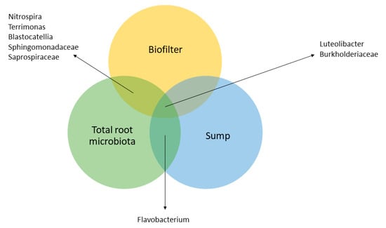 Figure 5 corroborates the presence of three distinct bacterial communities, i.e., in the sump, the biofilter and the lettuce roots while Figure 6 highlights the shared taxa between the compartments of the aquaponic system.