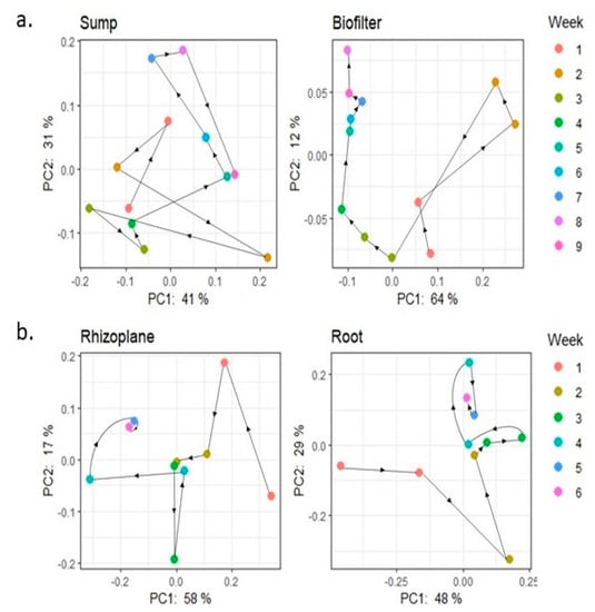 Weighted Unifrac PCoA per compartment showing the repartition of the samples week after week in the sump and biofilter (a) and in the rhizoplane and root (b) compartments. Arrows link the sampling dates in the chronological order. The biofilter, rhizoplane and root compartments seem to present an evolution throughout time.