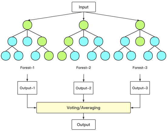 Random forest [34] is an important ensemble learning method based on Bagging (Bootstrap aggregating), which can be used for classification, regression and other problems. It uses the bootstrap re-sampling method to extract multiple samples from the original sample, models each bootstrap sample, and then combines the predictions of multiple decision trees to obtain the final prediction result through voting. A large number of theoretical and empirical studies [35,36,37] have proved that random forest has a high prediction accuracy, a good tolerance for outliers and noise and is not easy to overfit. In the training phase, the random forest uses bootstrap sampling to collect multiple different sub-training data sets from the input training data set to train multiple different decision trees in turn. The model architecture diagram of random forest is shown in Figure 3.