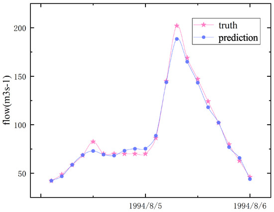 As shown in Figure 5, when training on No. 19940806, the effect is optimal when the prediction time is 20 h. Not only can it predict the changes in the flow in the basin, but it can also be accurate for the peak occurrence time and flood peak value. After the peak of Hong has been trained for many times, the error value is between 10 and 50 m/s, which can also be prevented in advance. The NSE reaches 0.87, and the accuracy rate is 0.9669.