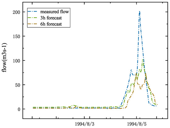 Figure 6 shows the comparison of the 3 and 6 h prediction results of the MSBP model. Although it is possible to predict the change trend of the river flow, the relative error of the flood peak and the peak present time are quite different. Compared with the 20 h forecast, there is still a big gap.