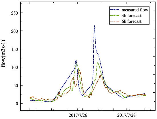 Figure 8 shows the 3 h and 6 h forecasts made by the MSBP model on No. 20170727. The forecast results are poor, and the peak present time and the flood peak error are quite different. Compared with the best 20 h forecast time result, there are obvious shortcomings.