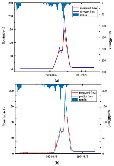 As shown in Figure 9a, it is the BP neural network prediction result of a single peak, the No. 19940805. According to the rainfall information measured by the rainfall station, floods will occur at the Zhaishang site when large rainfall occurs in the current basin. The BP neural network model can accurately predict the occurrence of flood peaks based on rainfall information. According to “Hydrological Information Forecast Specification” (GBT 22482-2008), the relative error of No. 19940805 is 0.16, the error of peak present time is 1 h, and the certainty coefficient is 0.9353. From this, it can be seen that the prediction level of No. 19940805 reached Class A.
