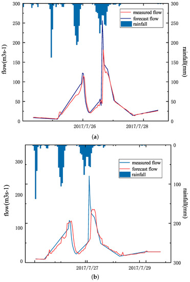 The forecasting process of flood No. 20170727. (a) Flood forecast results of the No. 20170727 flood under the BP neural network model. (b) Flood forecast results of the No. 20170727 flood under the random forest model. Among them, the blue line is the measured flow at the Zhaishang station, the red line is the predicted flow at the Zhaishang station, and the blue histogram is the rainfall value in the basin.