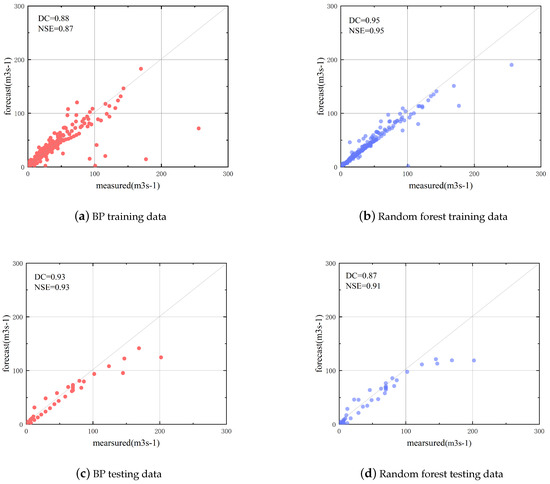 In Figure 11, the model scatter plots of the BP neural network and random forest used in the training and testing phases are shown, respectively. The prediction results show that the two models are generally consistent with the real measurement data of the two stages. In general, the BP neural network model has better performance than the random forest model (higher DC and NSE values, narrower discrete points). It can be concluded that the BP neural network can make more accurate predictions in the Zhaishang watershed than the random forest, and it is more suitable for the Fenhe River Basin.