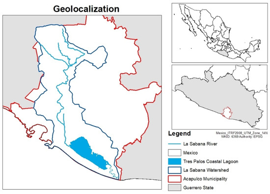 This research is applied to the Tres Palos coastal lagoon, which is located in the southeast part of the Acapulco Municipality, on the Pacific Ocean coast, in the state of Guerrero, Mexico (see Figure 1 below). This lagoon covers an area of 55 km2. Its average depth is 3.43 m during the dry season and 7 m during the rainy season. It is fed by the Rio de la Sabana and communicates with the sea through a meandering channel of 12 km that ends in the town of Barra Vieja.