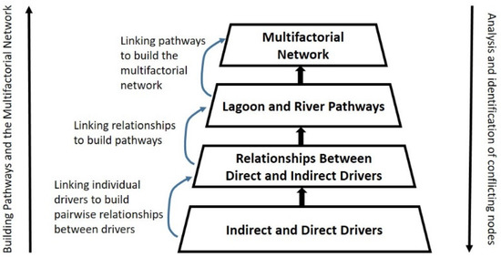 The bottom-up method is composed of the following levels: (i) at the bottom level, the individual factors are defined. Such factors are related to both direct and indirect drivers. These factors are described in the subsection related to the important definitions; (ii) at the second level, pairwise relationships between direct and indirect drivers are built. Two main forms of relationships are used in this work: the cause-effect relationships and the relationships that express the influence exerted by a factor on other factors; (iii) at the third level, the lagoon and river pathways are built by linking relationships; (iv) at the top level, the pathways of the lagoon and river are linked to build the multifactorial networks related to the lagoon and to the river.