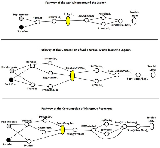 The developed pathways that link indirect drivers with direct drivers facilitated the understanding of the dynamic taking place in the eutrophication process of coastal lagoons. Pathways have also been used to identify key nodes, which are characterized by their potential to bring about temporal disorders that may increase the disturbances of the eutrophication process. The key nodes identified in the pathways are related to agricultural practices around the lagoon and along the river, solid urban waste generation at the level of the lagoon and river, consumption of mangrove resources leading to mangrove loss, generation of special handling waste at the level of the river, and wastewater treatment.