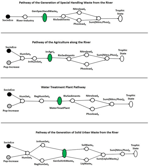 Meanwhile, the key nodes of the river pathways are shown in Figure 4. They belong to the categories of direct drivers: GenSpecHandWasteR, IrrAgriR, WaterTreatPlant, and GenSolUrbWasteR. These key nodes also require a temporal coordination between public polices, technological skills, and environmental culture programs to ameliorate their performance.