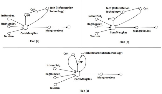 In the corrective Plan (a) (see Figure 5 below), in the relationship (ConsMangRes→PP), the key ConsMangRes node plays the role of an effector that leads to a public policy (PP node) being implemented which, in this case, plays the role of a receptor. Following this sequence, in the relationship (PP→Cult), PP plays the role of an effector that brings about the implementation of an environmental culture program which, in this case, plays the role of a receptor. In the next relationship, the Cult node would cause the implementation of a reforestation technology as shown by the following formulation (Cult→Tech). Finally, the link between the implementation of the reforestation technology and the key ConsMangRes node represents a feedback to verify the performance of this plan. Based on the analysis of this corrective plan (Plan (a) in Figure 5 below), we note that an environmental culture program takes place before the reforestation activities. From the point of view of the people’s perception, the fact of knowing, following, and participating in the process of reforestation produces an effect that wakes up the sense of ownership of the project. Otherwise, the environmental culture programs will be overlooked without any impact on the population. The analysis of this pattern shows that an incorrect sequence of corrective actions represents a temporal disorder represented by an incorrect coordination, where the environmental culture activities may turn out to be fruitless, thus putting at risk the efforts invested in the reforestation actions.