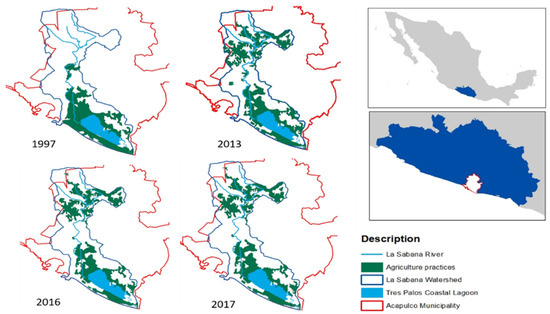 Agricultural practices contribute to the pollution of water in the fluvial-lagoon system formed by the Sabana River and the Tres Palos Lagoon. Agricultural practices usually increase as population increases, due to the installation of new settlements around the lagoon and along the river. The economy of the Acapulco municipality depends on tourist activities, mostly represented by national tourism, particularly with people coming from Mexico City every weekend of the year, during the summer and for end of year festivities. Thus, a major concern for this city is to establish how the level of pollution of local water resources could hinder the achievement of sustainable conditions relating to tourism activities. As mentioned before, the Tres Palos Coastal Lagoon is located in the Acapulco Municipality. For instance, the Sabana River-Tres Palos Lagoon area suffered an important population increase from 1970 to 2000. The population in 1970 was 186,595 and in 2000 it had increased to 648,431 inhabitants. That is, the population increased by 3.5 over 30 years, in the 17 settlements of the area. In 9 of these 17 settlements, agricultural practices take place, where residual materials, agrochemicals, and organic waste have significantly damaged water resources. Despite these damages the support based on the implementation of WWT plants have been insufficient, non-existent or operating under inefficient conditions along the course of the Sabana River [50].