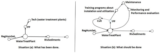 A similar analysis has been carried out for the case of the key WaterTreatPlant node. As we can see in the pathway associated with the key WaterTreatPlant node (see Figure 4), the waste produced by the regular human settlements along the river require the implementation of public policy, the use of adequate technology for the correct functioning of a water treatment plant, and obviously environmental culture programs. The nexus of these three activities aims at reducing the generation of waste. Figure 7 shows two situations, where situation (a) represents the implementation of most of the water treatment plants installed in the municipality of Acapulco. Meanwhile, situation (b) shows the sequence of the main actions to be implemented to avoid temporal disorders for the sake of a good water treatment plant performance.
