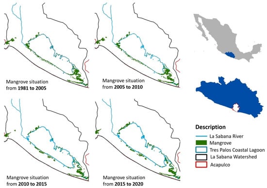 As a final reflection about the two key nodes (ConsMangRes and WaterTreatPlant) analyzed and discussed above, we show in Figure 8 a sequence of images that describes the mangrove distribution around the lagoon during the period 1981–2020, which is large enough to confirm the degradation of the mangrove during the last 39 years. The National Commission for the Knowledge and Use of Biodiversity (CONABIO, for its acronyms in Spanish) provides users with information related to the mangrove cover area, which is classified in four periods: 1981–2005, 2005–2010, 2010–2015, and 2015–2020. In the first period (1981–2005), the mangrove cover area was 1,046,646 ha, whereas for the last period (2015–2020) it was 653.99 ha. We observe (Figure 9) a degradation of the mangrove in the southwest of the lagoon during the periods (1981–2005) and (2005–2010). Meanwhile, due to the effects of reforestation activity, we observe certain recovery of the mangrove cover during the periods 2010–2015 and 2015–2020. However, if we take into account the total period 1981–2020, we ratify that, although the legal regulations mentioned before in relation to mangroves are clear enough, the mangrove cover area has decreased.