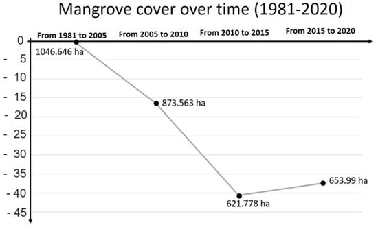The decreasing trend of the mangrove cover area from 1981 to 2010 is evident. However, due to a reforestation activity from 2008 to 2013, the mangrove has recovered more than 30 ha of the mangrove area during the last two periods.