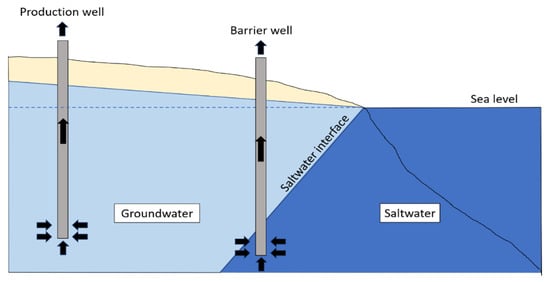 Various countermeasures have been developed to prevent saltwater intrusion. They are primarily categorized into three different groups: conventional methods, physical barriers, and hydraulic barriers [10]. Among these countermeasures, a negative hydraulic barrier using barrier wells pumping saline or brackish water is widely used (Figure 1). The extracted water can be directly discharged into the sea or used as a water source for desalination plants. Stein et al. [11] demonstrated that this method can provide an alternative water source for desalination plants, as well as remediate saltwater intrusion, while simultaneously pumping freshwater inland for domestic or industrial use. Besides, this method has a good applicability, as it does not need any other water source for the application, and existing wells can also be utilized as a barrier well. Considering these advantages, many studies have investigated the saltwater pumping process.