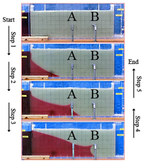 The experiment consisted of five steps (Figure 3). When the steady state was achieved in the ongoing step, the experiment was moved to the next step. The experiment continued until all steps were completed; the process was recorded using a digital camera. Step 1 represents the formation of a saltwater wedge because of the head differences between fresh and salt water. In Step 2, water was pumped from Well A, and the advancement of the salt–freshwater interface was observed for different water pumping rates. This was followed by Step 3, in which water was pumped simultaneously from Wells A and B. Further advancement of the salt–freshwater interface was observed at this stage and compared to the respective pumping ratios in each experiment. Step 4 began when pumping from Well B was turned off, resulting in the saltwater intrusion retreating to the steady-state position that was achieved in Step 2. Step 5 began when pumping from Well A was turned off; thus, no more water was pumped from the experimental device. The saltwater intrusion retracted to the position of the steady state achieved in Step 1. One full experiment, including all five steps, was performed six times with different pumping ratios to ensure that comparative considerations can be carried out on test results to consider the positive effect of preventing salinization by pumping saltwater from the barrier well. The experimental parameters, including hydraulic conductivities, pumping rates from wells A and B, and pumping ratios are presented in Table 1.