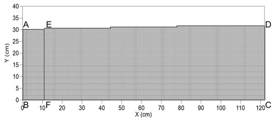 The above equations are valid when the Reynolds number ranges from 0.05 to 3.5. In this study, the Reynolds number was calculated to be 0.17; therefore, the above equations can be applied for longitudinal and transverse dispersion lengths. The numerical and hydrological parameters used are listed in Table 3. The model boundaries are defined as shown in Figure 4. Table 4 lists the boundary conditions of each boundary. The model consisted of six boundaries: the top surface of saltwater (AE), top surface of freshwater (ED), bottom surface (BC), saltwater boundary (EF), and two vertical boundaries (AB and CD). For the bottom surface, no discharge flow boundary was assigned. The other boundaries were assigned with time-dependent pressure head boundaries that varied with the water table heights of the boundaries. The concentrations at the boundaries were defined as zero at the right vertical boundary and 100% at the left vertical boundary. For the top and bottom boundaries, the concentration gradient was zero. In the numerical simulation, the hydraulic conductivity and pumping rates from the barrier and production wells were changed in each case, as well as in the lab-scale experiments, to run the model under the same conditions as the experiments. Therefore, the hydraulic conductivity, the pumping rates at the barrier and production wells, and the pumping ratio between the barrier and production wells were decided to be the same as the experiments as shown in Table 1. The numerical model was coded in the FORTRAN programming language and run using Microsoft Visual Studio 2008. The validity of this model was confirmed by visually comparing the simulated and experimental results for each step.