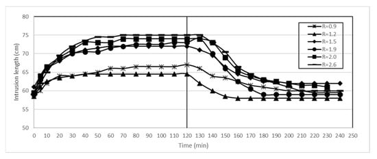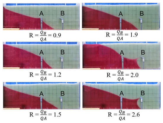 At the end of Step 3, saltwater intrusion toward Well B exhibited varying behaviors owing to different pumping ratios (Figure 5). Table 5 shows the intrusion length, time to steady, and observation of upconing in Step 3. When the water pumping ratio was less than 1.2, the saltwater intrusion was not observed near Well B. When the ratio was within 1.2 to 1.9, the salt–freshwater interface curve moved right and upward without upconing to Well B. However, when the ratio was beyond 2.0, the upconing of saltwater into Well B was observed. In addition, the longest time was required to achieve the steady state at the ratios of 1.9 and 2.0, which indicates that the critical pumping ratio between the barrier and production wells was 1.9. To confirm whether the saltwater reached Well B with a pumping ratio of approximately 2.0, a secondary test was performed, and the results are shown in Figure 6. In this test, when the steady state of Step 3 was reached with a pumping ratio of 1.9, but without salinization of Well B, the pumping rate at Well B was increased so that the pumping ratio was equal to 2.3. As a result, the saltwater reached Well B after increasing the pumping ratio from 1.9 to 2.3. Therefore, within the frames of this experiment, the critical pumping ratio between the barrier and production wells was considered to be 1.9. Moreover, if the amount of water pumped from the production well did not exceed 1.9 times the amount of water pumped from the barrier well, the freshwater can be continuously pumped from the production well without salinization. Additionally, provided the pumpable amount of freshwater from the production well was determined by the pumping ratio, the pumped amount from the barrier well increased with that from the production well without risking production well salinization.