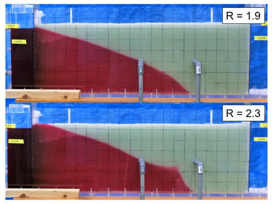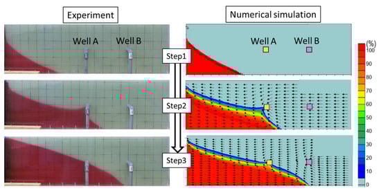 The experimental and numerical results were compared based on the general condition of the fresh-saltwater interface and the intrusion length at each steady state. The error in the intrusion length was less than 2.5 cm in any cases, and the general shape of the fresh–saltwater interface was calculated with high accuracy. Figure 9 shows the experimental and numerical results in Step 1, 2, and 3 for R = 1.9 as an example. As shown in the figure, the general shape of the interface was accurate and the error in the intrusion length was less than 1 cm in each step. Therefore, it was regarded that the numerical simulation was reliable in this study.