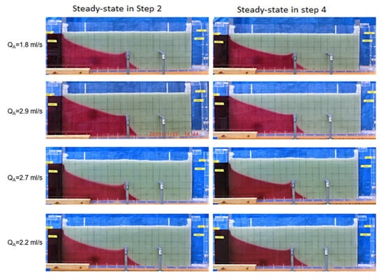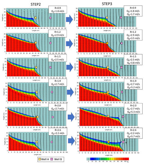 When pumping from Well B was stopped at Step 4, a retreat of the salt–freshwater interface was observed. Furthermore, even when the pumping ratio exceeded 1.9, with which Well B was salinized, the upconing toward Well B disappeared and the salt–freshwater interface retreated to its initial position. Figure 7 represents the change in saltwater intrusion length at its toe position over time from the end of Steps 2–4. The toe position of the saltwater moved to its initial position at the end of Step 4. Furthermore, comparing saltwater intrusion areas recorded at the end of Step 2 with those recorded at Step 4, the positions, shapes, and areas of saltwater in both steps were found to be almost identical, indicating that the salt–freshwater interface retreated to the same position before pumping from Well B started (Figure 8). Therefore, it is considered that despite the salinization of the production well, the barrier well has a positive effect on retreating the saltwater intrusion toward the previous state.