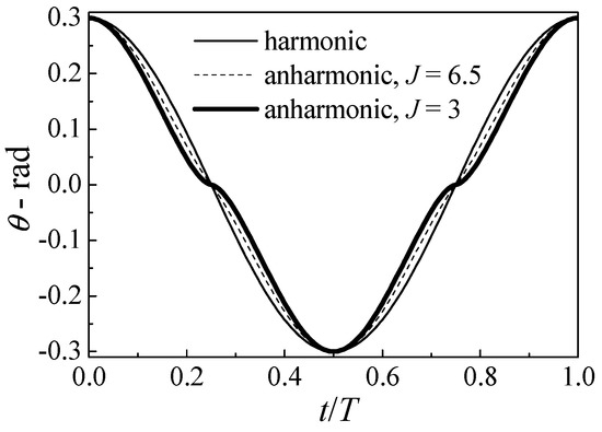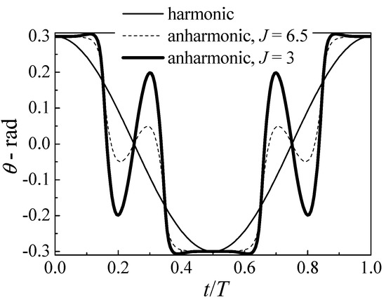 Subsequently, the curve of the attack angle is still constructed by g1(t) function. According to the relationship between the pitching angle, the attack angle, and the relative velocity angle, the curve of the pitching angle can be obtained. Because the design of the attack angle curve must take a certain St number as a reference. Here, the same two St numbers as before, 1/3 and 1/6.5, were chosen in this part, with the maximum pitching angle 0.3rad, to obtain two sets of pitching angle curves, as shown in Figure 5, denoted as anharmonic (J = 6.5) and anharmonic (J = 3), respectively. It can be seen from Figure 5 that there are some points of abrupt acceleration in the pitching angle curve, which means that the power in the rotation direction will increase. This is not conducive to improving efficiency. Therefore, the situation that both heaving motion and pitching motion are anharmonic is not analyzed further in this paper.