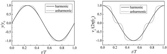 Harmonic and anharmonic (n = 1) Y-direction displacement (left) and heave velocity curves (right).
