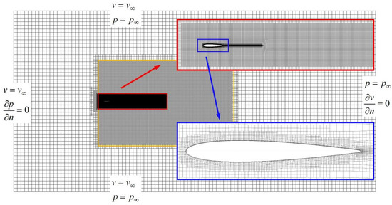 In this paper, the CFD software, FINE/Marine (a software package of NUMECA company, Brussels, Belgium; EURANUS solver is developed by European Space Agency, Paris, France), is used to investigate the hydrodynamic performance of flapping foil propulsor. The simulation uses dynamic mesh to simulate the moving object. The setting methods of boundary conditions are shown in Figure 6. The boundary condition of foil surface is set as the non-slip wall boundary to simulate the boundary layer flow. Four outside boundaries of the computational domain are set as far-field boundaries, in which the upper, lower, and right boundaries are given velocity and pressure, and the left boundary is given velocity and extrapolated pressure.
