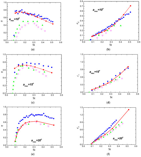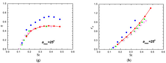 Comparisons of the propulsive efficiency η and the thrust coefficient cT with previous computational and experimental results. at different amax. (a) Propulsive efficiency comparison with amax = 10°; (b) Thrust coefficient comparison with amax = 10°; (c) Propulsive efficiency comparison with amax = 15°; (d) Thrust coefficient comparison with amax = 15°; (e) Propulsive efficiency comparison with amax = 20°; (f) Thrust coefficient comparison with amax = 20°; (g) Propulsive efficiency comparison with amax = 25°; (h) Thrust coefficient comparison with amax = 25°. (The red curve