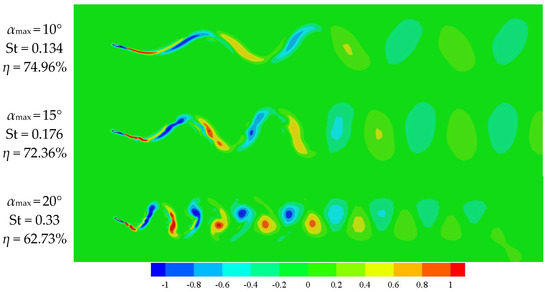 In order to validate the numerical method used in the current work, selected benchmark conditions in Anderson’s [3], Read’s [11], and Schoveiler’s [4] experiments are simulated, in which a rigid two-dimensional NACA 0012 airfoil is used. The heave amplitude-to-chord ratio y0/c is 0.75, and the pitching axis is 1/3 chord from the leading edge of the airfoil. The comparisons are shown in Figure 8. These three papers are from the same laboratory with the same foil working in similar conditions, but the results of the three papers are not consistent, which shows that the research in this area has room to develop. It can be seen from Figure 8 that when the maximum AOA αmax is 10°, the present numerical results agree well with the previous Anderson’s experiment results; when αmax is 25°, the results in this paper are in good agreement with Read and Schoveiler’s work; when αmax is 15° and 20°, the results in this paper are roughly in the middle of the previous three experimental results. Moreover, vorticity fields of some higher efficiency points are shown in Figure 9. The vortex street in the wake flow can be clearly observed from the calculation results.