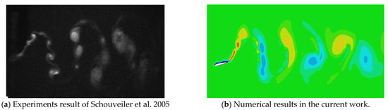 In order to validate the numerical method used in the current work, the calculation results under the same condition have also been compared with data from those experiments results, as described by Schoveiler [4]. Figure 10 is vorticity pattern visualized in the foil wake for St = 0.45, f = 1.2 Hz, amax = 20°. The experimental and the calculated results are compared and shown in Figure 10a,b separately, which agree with each other. In addition to qualitative comparison, we also compared the force measurements in Figure 11, Fx, Fy and Mz for St = 0.3, f = 0.8 Hz, amax = 20°, which demonstrates the accuracy of the simulation.