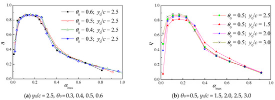 Through the analysis of many working conditions, a more universal relationship between the maximum AoA and efficiency is obtained in this paper. Firstly, from Figure 12a, it appears that when the heave amplitude-to-chord ratio y0/c is fixed at 2.5, the efficiency curves under different pitching amplitude θ0 almost coincide with each other. That is, pitching amplitude θ0 has little impact on the highest efficiency point. Then, when pitching amplitude θ0 is not changed, Figure 12b shows that the maximum efficiencies increase obviously with the increase of the heave amplitude-to-chord ratio y0/c, although the four efficiency curves are basically the same. The maximum efficiency value gains an increase from 81.7% to 88.4%. Finally, through the analysis of many working conditions, a more universal relationship between the maximum angle of attack and efficiency is obtained. In Figure 12, the curves trend of efficiency with the AoA are basically the same under various conditions. When the maximum AoA αmax is between 6° and 12°, the efficiency value reaches the maximum. The results show that αmax plays a more important role in foil efficiency than pitch and heave amplitude, which is in good agreement with previous research results [3,10,18,19,28], and the regularity is clearer in this paper.