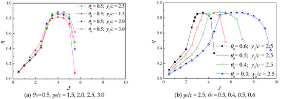 For the convenience of engineering application and comparison with the propeller, this part refers to the expression of Floc’h [5] on the advance coefficient J of the flapping foil propeller. The propulsion efficiency η and advance coefficient J under different heaving amplitudes and pitching angles are calculated according to Formula (5), as shown in Figure 13. It can be seen from Figure 13a that when the pitching amplitude θ0 is constant as 0.5, the efficiency curves under different heave amplitude-to-chord ratio y0/c almost coincide with each other. That is, the influence of the heaving amplitude on the advance coefficient J is small. However, in Figure 13b, when the heave amplitude-to-chord ratio y0/c is fixed, the change of pitching amplitude θ0 has a much larger influence on the advance coefficient J. On one hand, when the pitching amplitude becomes smaller, the maximum efficiency point of the flapping foil propeller deviates to a higher advance coefficient J. On the other hand, compared with the case of the larger pitching amplitude θ0, the range of maximum efficiency with a smaller pitching amplitude θ0 is much larger. Since the ship and vehicle usually work at a speed close to the propeller’s highest efficiency, a smaller pitching amplitude θ0 means a larger working range.