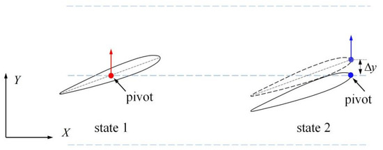 Δs is defined as the displacement of the pivot in the chordwise direction, and it is positive in the tailing edge direction. Δφ is defined as the change of the phase difference between the two states of the foil. Compared with state 1, state 2 is completely equivalent, but the change of phase difference Δφ = −2πf Δt, and the pivot displacement Δs = −c/2. The relationship between Δs and Δφ is derived from the geometric relationship as follows. As shown in Figure 14, the distance between the leading edge and the center line Δy can be written as follows: