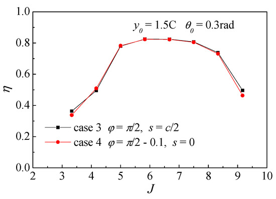 Firstly, the reliability of this formula is verified by comparing the first four working conditions. Case 1 and case 2 are compared to verify the accuracy of the equivalent formula under the condition of larger pitching angle and smaller heaving amplitude, which is shown in Figure 15. Case 3 and case 4 in Figure 16 are chosen to verify the accuracy of the equivalent formula under the condition of smaller pitching angle and larger heaving amplitude. The propulsive efficiency curves of the first two cases are shown in Figure 15. It is found that the efficiency curves of the two cases are slightly different, but the maximum efficiency value of them is the same. While, in the next two cases, the rotating axial moves toward the leading- edge direction, and the phase angle is reduced proportionally. It can be seen from Figure 16 that the efficiency curves of the two are almost overlapped with each other, that is, the working conditions of Case 3 and Case 4 are practically identical.