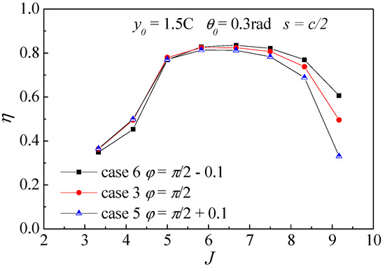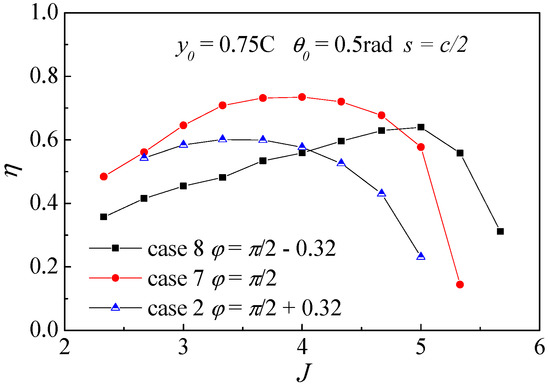 Then, the influence of phase difference on efficiency is further analyzed through the comparative study of the latter six cases. As shown in Figure 18, the comparison of Case 3, Case 5 and Case 6 shows the effect of phase difference on efficiency under smaller pitching angle and larger heaving amplitude; And Case 2, Case 7 and Case 8 are chosen for the comparative study of that under the condition of larger pitching angle and smaller heaving amplitude in Figure 19. From Figure 18, under the smaller pitching angle and larger heaving amplitude condition, the maximum efficiency of the three are almost the same, but the efficiency curve slightly deviates upward with the decrease of phase difference. That is, after exceeding the maximum efficiency point, under the same advance coefficient J, a smaller phase difference is conducive to maintaining higher efficiency. From the comparison results shown in Figure 19, It is found that the efficiency curve does not shift regularly with the increase of phase difference under large pitching angle and small heave amplitude condition. However, viewing the situation from a whole, the maximum efficiency point is gradually shifted to the left with the increase of phase difference, and when the phase difference is 90°, the peak efficiency is the highest. From the comparison of the above two groups, we can see that the effect of phase difference on efficiency is also related to the heaving amplitude and pitching angle, and there is no exact rule. Further analysis should be made according to the specific situation in the future.