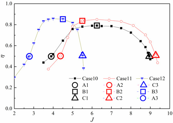 Efficiency curve and nine analysis points selected in three cases.