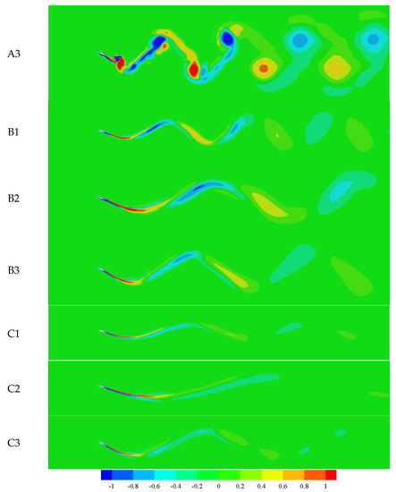Vorticity distribution at nine analysis points. Colors represent positive (red) and negative (blue) vorticity. (A1)–(C3) represent nine analysis points which are shown in Figure 21.