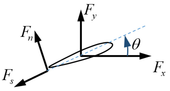 Then, according to the above analysis, when the parameters of the flapping foil are determined, the forces that affect the propulsion efficiency are only Fx and Fy. In previous studies, the forces on airfoil are usually divided into drag R along the relative inflow and lift L perpendicular to the relative inflow. However, since the inflow angle and attack angle of the flapping foil change at any time during the working process, its lift coefficient is also unstable, which is not only related to the AoA, but also related to the angular velocity of motion, so it is difficult to analyze according to the lift and resistance. In this paper, the forces on the airfoil are divided into Fs along the chordwise direction and Fn perpendicular to the chordwise direction for analysis. As shown in Figure 24, the relationship between the forces is shown as follows: