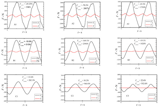 The Fs and Fn curves of nine working points calculated from the above formula are shown in Figure 25. First of all, it can be seen intuitively from the results that under any working condition, compared with the normal force Fn, the chord force Fs is very small and can be ignored. At the same time, we also found that under the same motion parameters, when the working point moves from A to C, the normal force Fn decreases gradually, while the efficiency does not decrease with the decrease of the normal force Fn, but reaches the peak at point B. At the same time, compared with A and C, the phase difference of the two forces at point B is much closer to 90. Therefore, comparing the different operating points of the same flapping foil, this paper cannot clear the relationship between Fn and the highest efficiency point yet. However, it can be determined that since Fs is smaller than Fn, the resultant force of Fx and Fy is mainly determined by Fn. Therefore, if the corresponding relationship between Fn and motion parameters can be determined, the efficiency under the motion parameters can be directly obtained. However, because there are many motion parameters that affect Fn, and the relationship between them is complex, this paper has not made an in-depth study; this part of the work will be gradually improved in future work. Finally, from the average value of Fs and the maximum value of Fn also given in Figure 25, it can be seen that at point C, the average value of chord force Fs is positive, which indicates the viscous resistance; while, at point A and point B, the average value of chord force Fs is negative, that is, the chord force points to the leading edge, which is a special phenomenon. According to the conventional imagination, the chord force of the airfoil should be along the flow direction, which is the result of the viscous effect, but in the flapping foil, we found that the force may be against the flow direction.