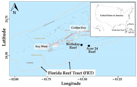 The two sites selected for this study, Birthday Reef (24.57917′ N, −81.49692′ W) and Acer24 Reef (24.55268′ N, −81.43741′ W), are representative of an inshore patch reef and offshore bank reef environment, respectively (Figure 1). The reefs are located adjacent to one another along Hawk Channel within the lower region of the Florida Keys National Marine Sanctuary (FKNMS). At both sites, reef communities are found at a similar depth (6 m). Inshore patch reefs of this region are characterized by greater abundance and diversity of scleractinian coral, increased variance in SWTs, and increased turbidity relative to the offshore reefs [22].