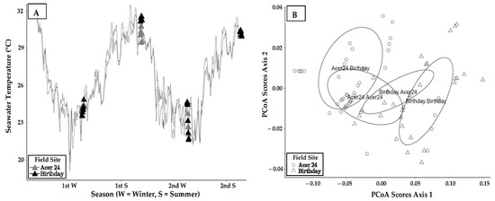 (A) Figure displays hourly water temperature for Birthday Reef (black triangle, black dotted line, inshore patch reef) and Acer 24 (gray triangle, gray solid line, offshore bank reef) over the course of a two-year reciprocal transplant experiment. Daily water temperature means are presented for the day of sampling for each of the four sample periods as well as the mean daily water temperatures for the previous 6 days prior to sampling corals at the Acer24 and Birthday Reef field site. Note: First summer (1st S) and winter (1st W) vs. second summer (2nd S) and winter (2nd W) are shown. (B) Principal coordinate analysis (PCA) results indicating a collection site-dependent effect on transcript abundance. Manhattan distances of transcript abundances were used to create the distance matrix. Axes 1 and 2 are plotted. The labels represent the mean of axis 1 and axis 2 for each group. Open circles indicate corals collected from Acer24 Reef and open triangles represent those collected from Birthday Reef.