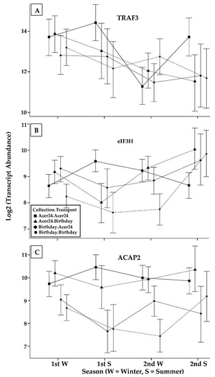 Distinct patterns of transcript abundance were identified for each of the three GOI. The expression of TRAF3 differed between winter and summer but only for samples transplanted to Acer24. Significant transplant site-dependent effects were apparent in the expression of eIF3H during summer while a collection-site dependent effect was observed for ACAP2 across all sampling periods. We also observed that the direction and magnitude of the slope associated with the previous week of temperature change was a significant factor affecting gene expression while the previous days SWT during a given sampling event was not.